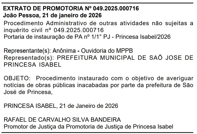 O caso está sob responsabilidade do promotor de Justiça Rafael de Carvalho Silva Bandeira, da Promotoria de Justiça de Princesa Isabel, que vai acompanhar as informações e cobrar explicações da gestão municipal.