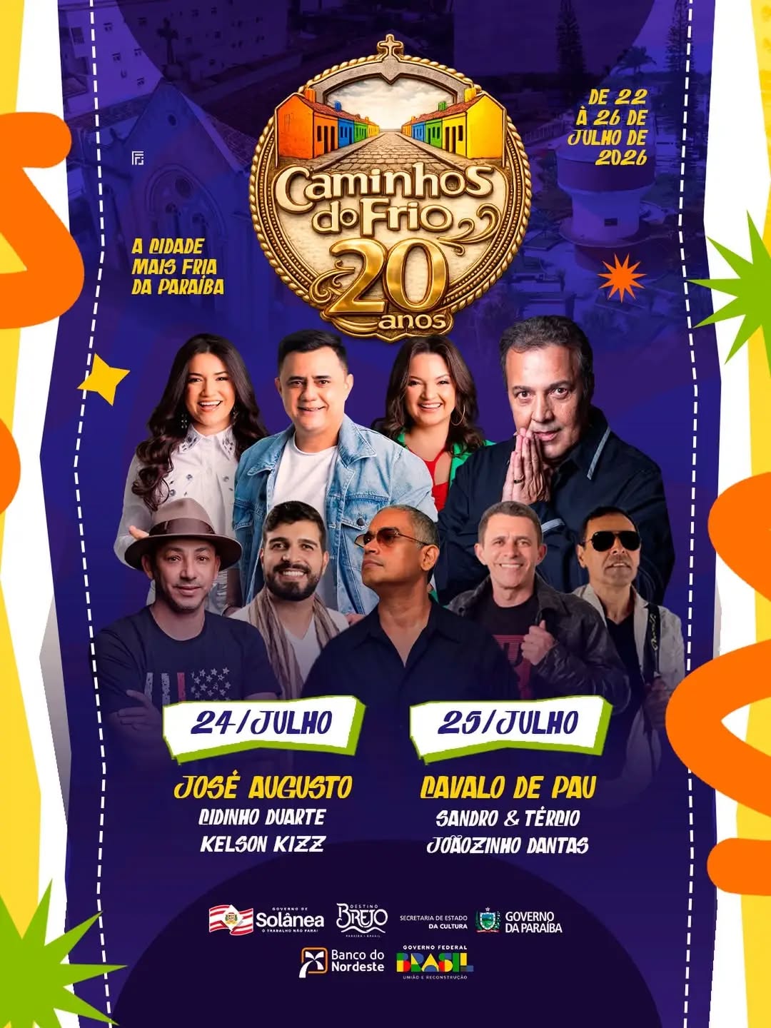 A cidade de Solânea, no Brejo paraibano, divulgou a programação oficial de shows para a etapa local da Rota Cultural Caminhos do Frio 2026. Celebrando duas décadas de existência, o evento na cidade acontece entre os dias 22 e 26 de julho, prometendo atrair turistas para as baixas temperaturas da Serra da Borborema.